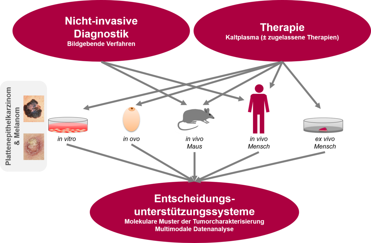 Dies soll durch gezielte Anpassung der technischen Parameter – wie Gaszusammensetzung, Spannung, Frequenz oder Düsengeometrie – gelingen, die die Zusammensetzung der erzeugten Plasmakomponenten, insbesondere die Konzentration reaktiver Sauerstoff- und Stickstoffspezies (RONS), beeinflussen. Die geplante Entwicklung umfasst den Bau eines funktionsfähigen Labormusters und dessen physikochemische Charakterisierung auf Grundlage der DIN-Normen (SPEC 91315). Parallel erfolgt eine umfassende biologische Testung in verschiedenen Modellsystemen: von 2D-Zellkulturen (Prof. Hinz) über 3D-Organoide im bebrüteten Hühnerembryo (Prof. Bekeschus) bis zu Mausmodellen (Prof. Vollmar). Die molekularen Wirkmechanismen der Kaltplasmaanwendung werden u. a. mittels RNA-Sequenzierung (PD Dr. Murua Escobar) und unter hypoxischen Bedingungen (Prof. Hinz) untersucht, um relevante Signalwege und Resistenzen zu identifizieren. Die Auswirkungen der Behandlung auf gesundes Gewebe und Tumorgewebe werden zusätzlich durch bildgebende Verfahren evaluiert (Prof. Emmert, Prof. Hornberger). Durch die enge Verzahnung mit spektroskopischen Diagnostikverfahren entsteht ein integrierter Analyseansatz, der Therapieeffekte bildgebend sichtbar macht und zugleich neue Wege der Hautkrebstherapie eröffnet.